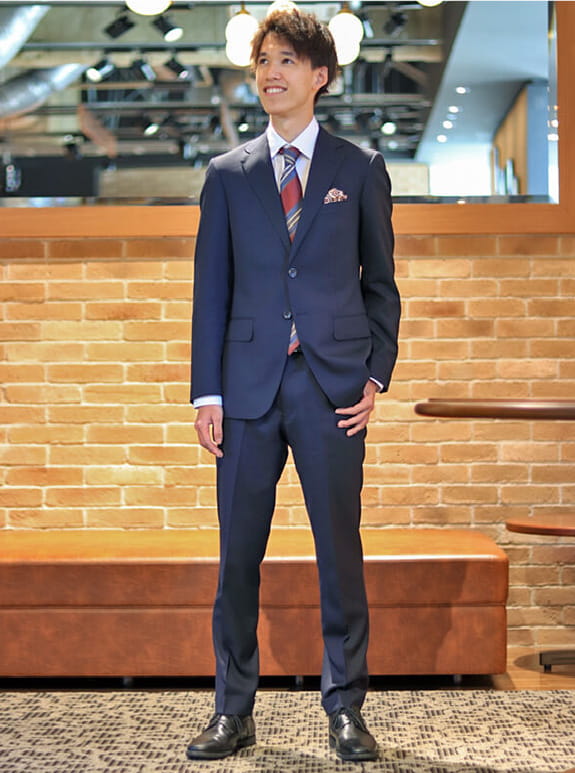 D.F. 様4月から新社会人になるので、まずはきちんとしたスーツを仕立てました!ネイビースーツで好印象を与えつつ、着回しのしやすいスーツで、これから長く着ていきたいと思います。