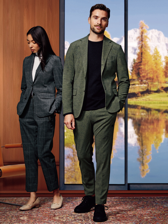 深みのあるグリーンのツイード調生地の表情もプリントには見えない生地感。落ち着きのある表情とは裏腹に、驚くほど軽やかかつ伸びやかな着心地です。