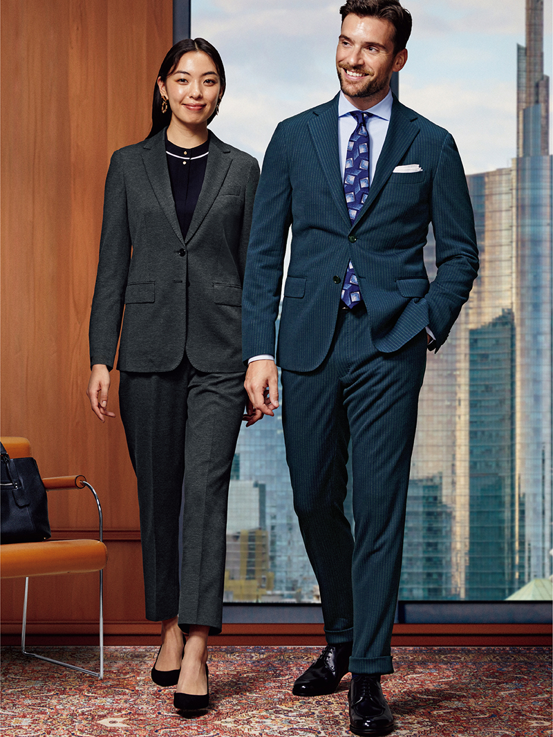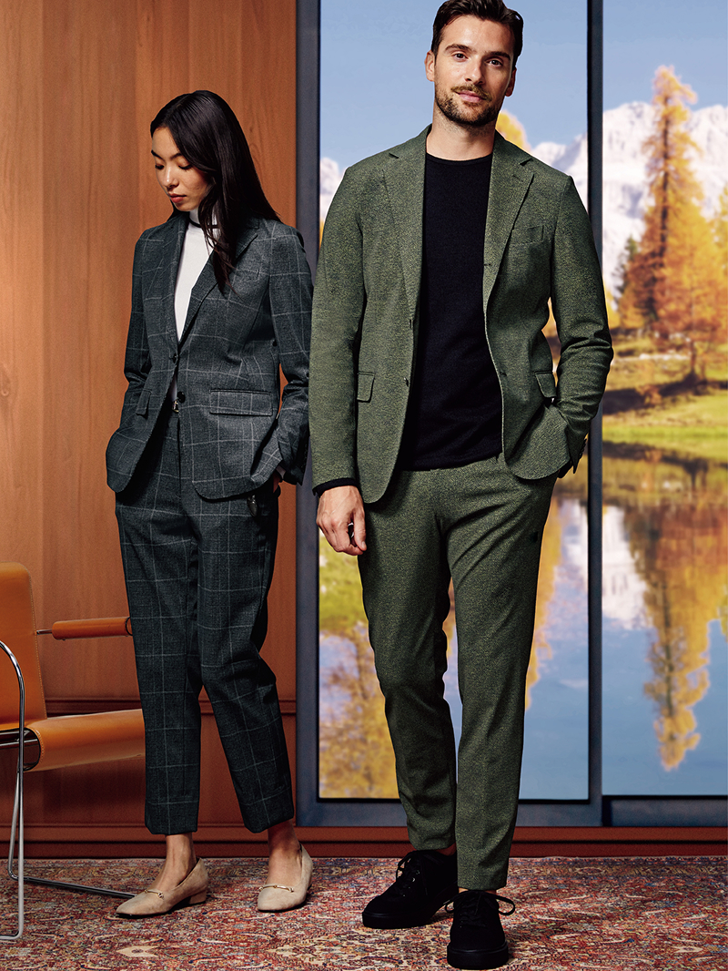 ビジネスウェアとしてはもちろん、仕事帰りの軽スポーツも楽しめるほど抜群のストレッチ性を誇る「オンリーグリーン」のセットアップ。ニットやカットソー合わせにも最適です。