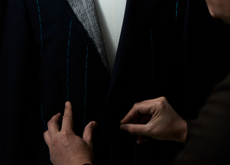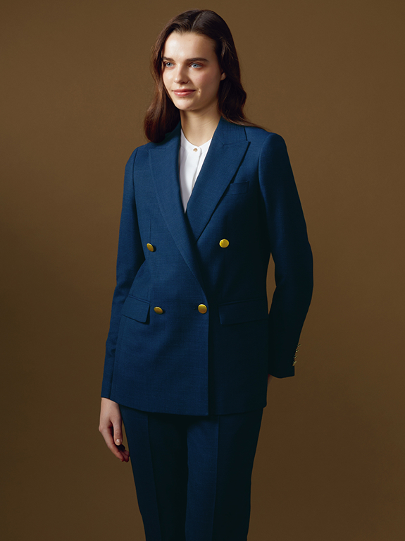 軽快で通気性抜群のポリエステルウール製ホップサックを用いたネイビースーツは、色合いも春夏らしくやや明るめ。それでいてダブルブレストならではのきちんとした雰囲気で、どんな席にも通用します。