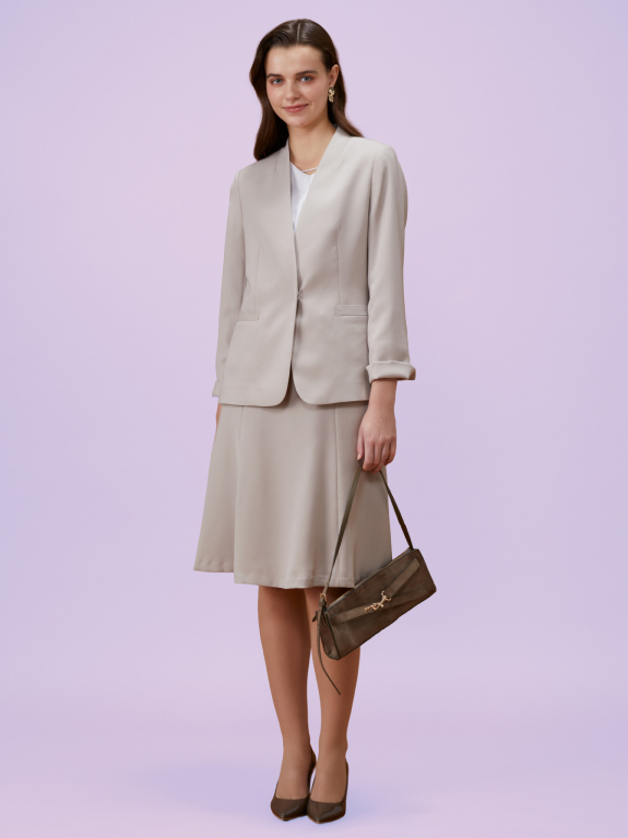 晴れやかな場にはベージュで華やぎを。シングルジャケットのすっきり感とスカートで女性らしさと上品さをプラス。卒入学やセレモニーに最適です。小ぶりなバッグでシンプルながらもフォーマルな印象を与えてくれます。