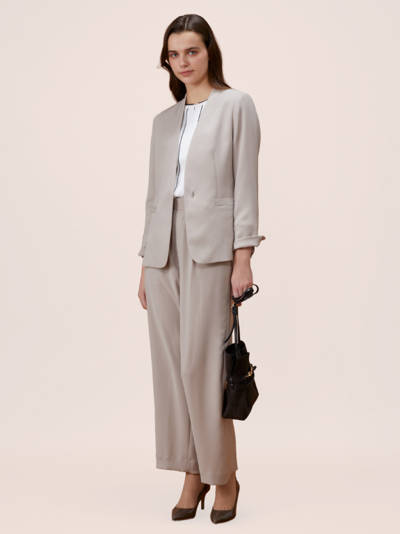 詳細はこちらノーカラーセットアップの新しい使い方。選べる組み合わせで、ハレの日の装いから日常の仕事まで活躍します。