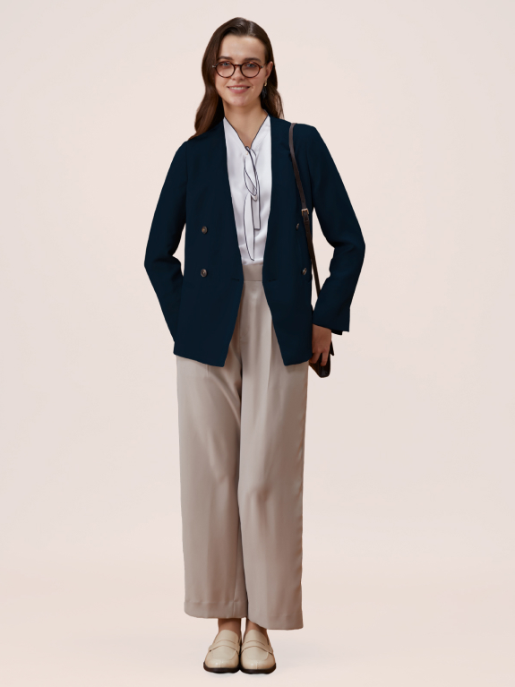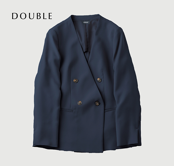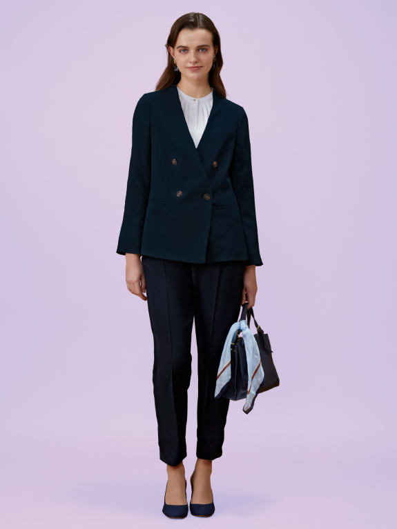 ダブルジャケットで格式ある佇まいとテーパードなパンツで端正なシルエットに。ネイビーならではの安心感でフォーマル寄りの式典や公式な場に。