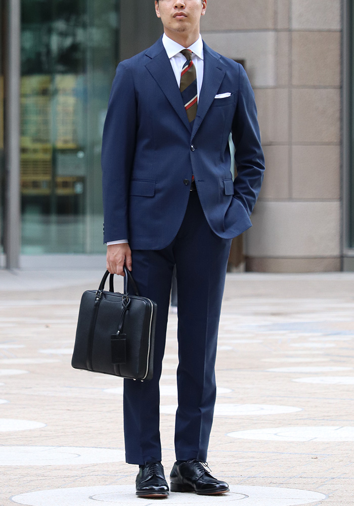 ビジネスシーンにふさわしい、王道のスタイル。シャツとネクタイを合わせるだけで、セットアップの端正なシルエットが際立ちます。パンツはベルト仕様でまとめて、クラシックな雰囲気に。