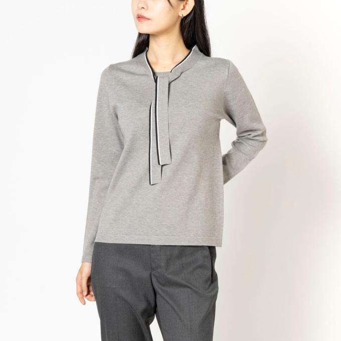 やわらかな素材と細身のボウタイで、フェミニンになりすぎず上品にまとまる一枚。ジャケットを羽織っても首元に立体感が残るため、オンライン会議や商談の日にも活躍。かっちりしすぎないきれいさが大人の女性にちょうどいい。