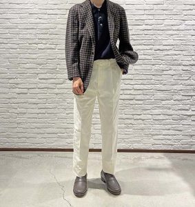 きれいめな仕立てでありつつもリラックス感漂う雰囲気で、ビジネスカジュアルはもちろんオフスタイルでも活躍する一着です。