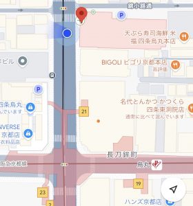 京都市営地下鉄「四条駅」、阪急京都線「烏丸駅」の21番出口を出て北を向くとすぐに店舗がございますので