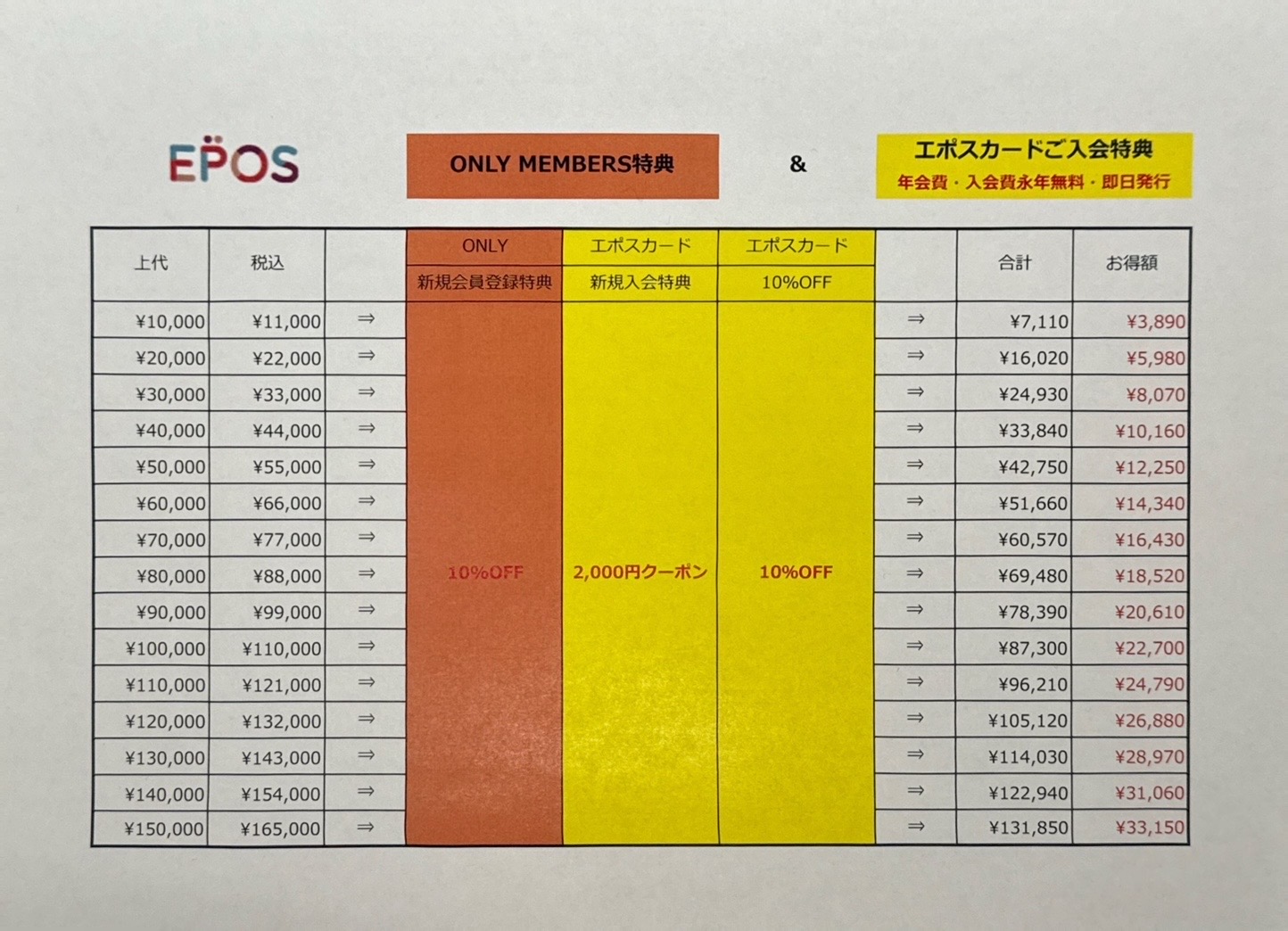 こちらはエポスカードのご利用でご請求額から10%割引が適応されます。