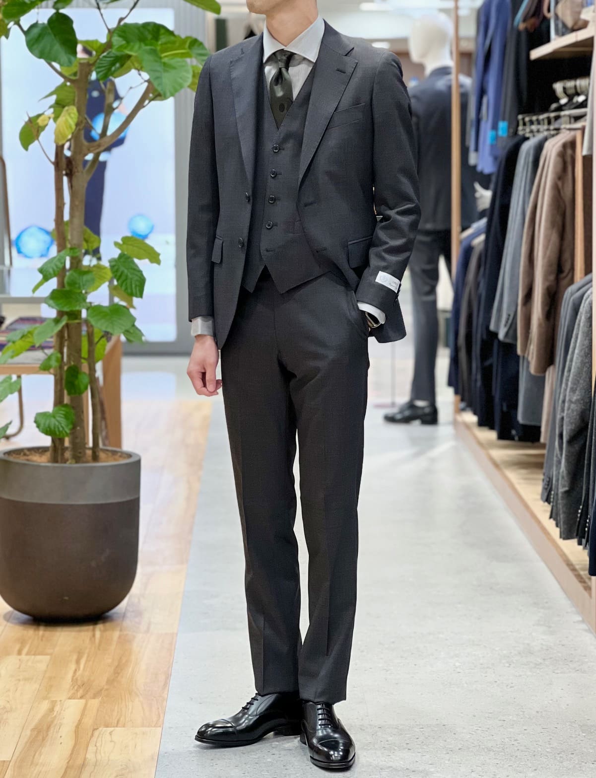 ハリとコシのあるチャコールのシャークスキンを用いたスリーピーススーツ。