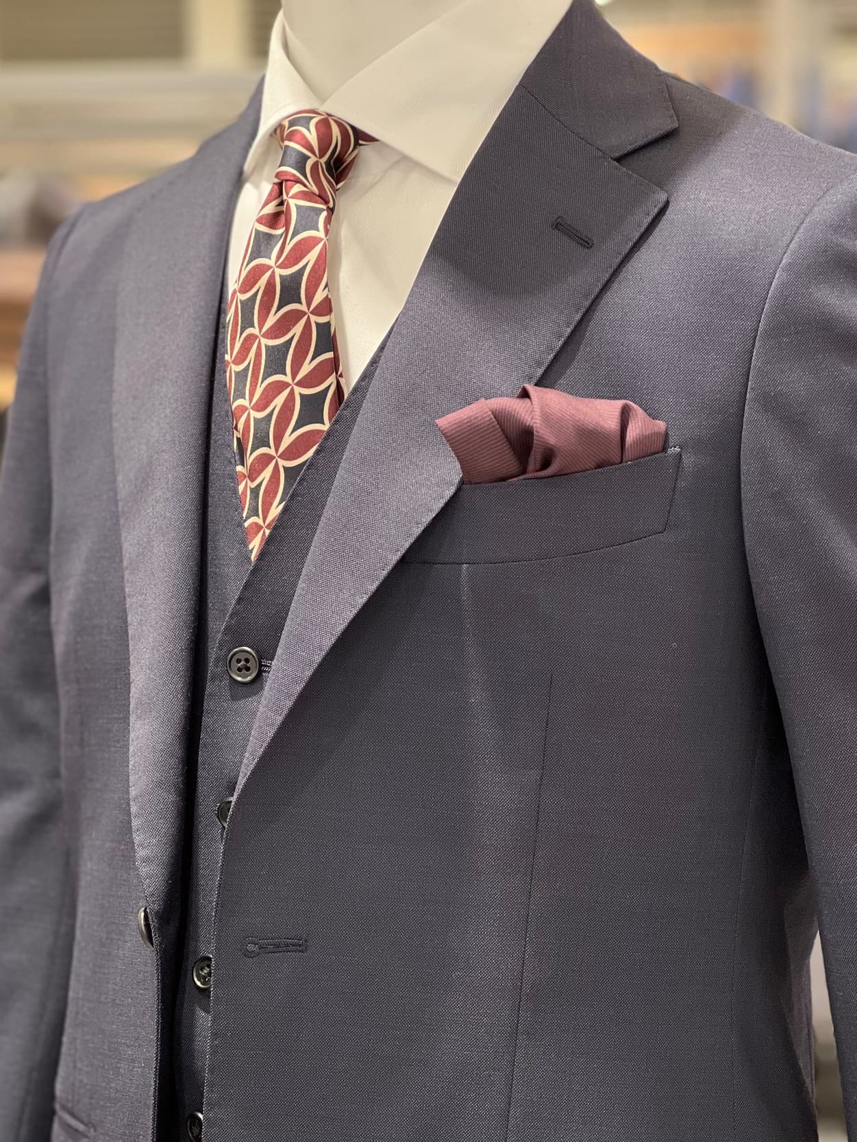 シンプル目なシャツにレッドのネクタイ、チーフをいれてあげると華やかさを演出できます!