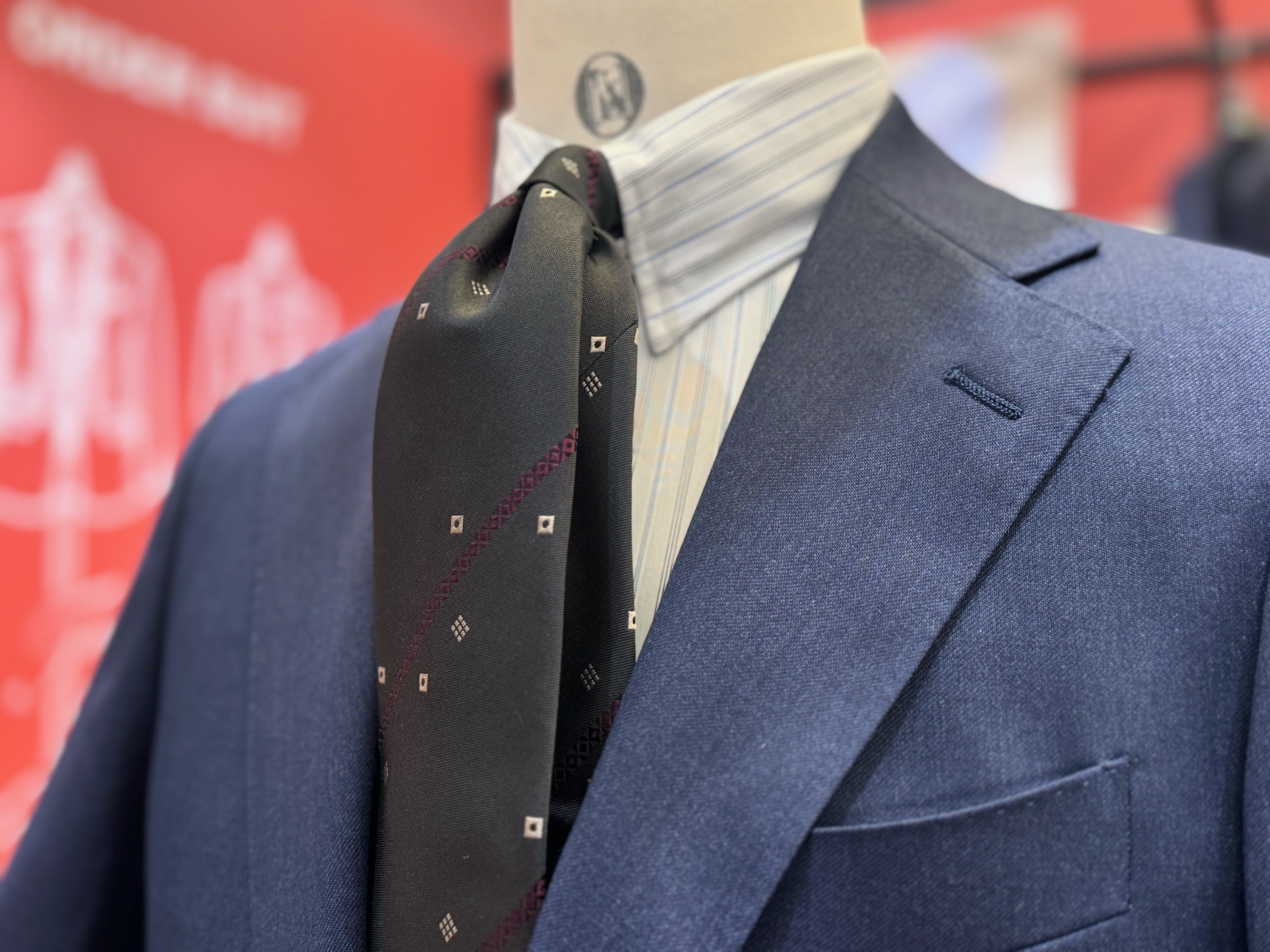 派手なシャツやネクタイも良いですが、タイが映えるタブカラーシャツや幾何学模様のシルクタイは周りと被らずに出来るさりげない洒落感です。