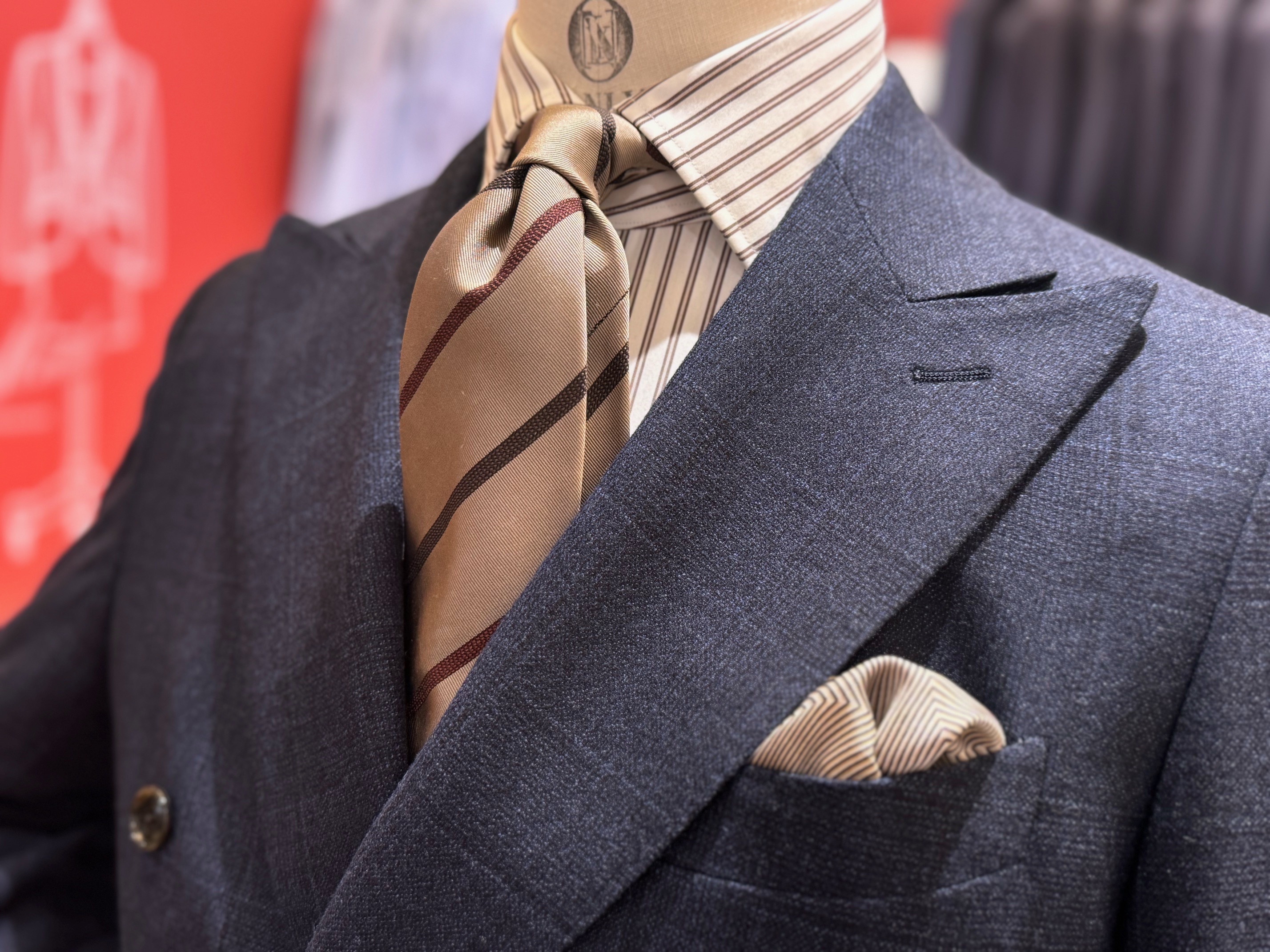 シャツとネクタイは更に親しみやすさを出すために暖色のベージュやブラウンを基調としています。