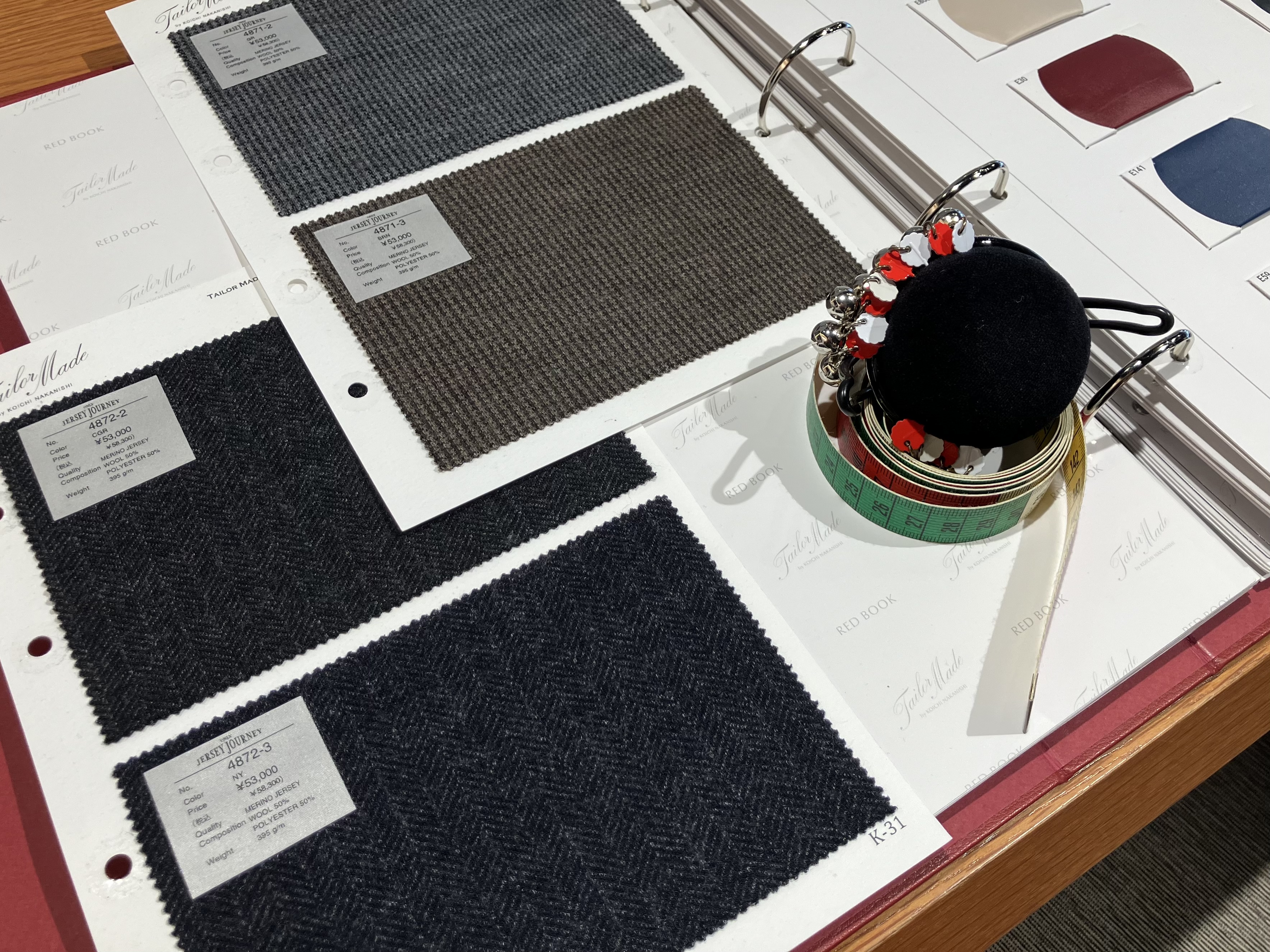 ご紹介したブラウン千鳥柄とネイビーストライプ柄はオーダースーツの生地としてもご用意しておりますので、