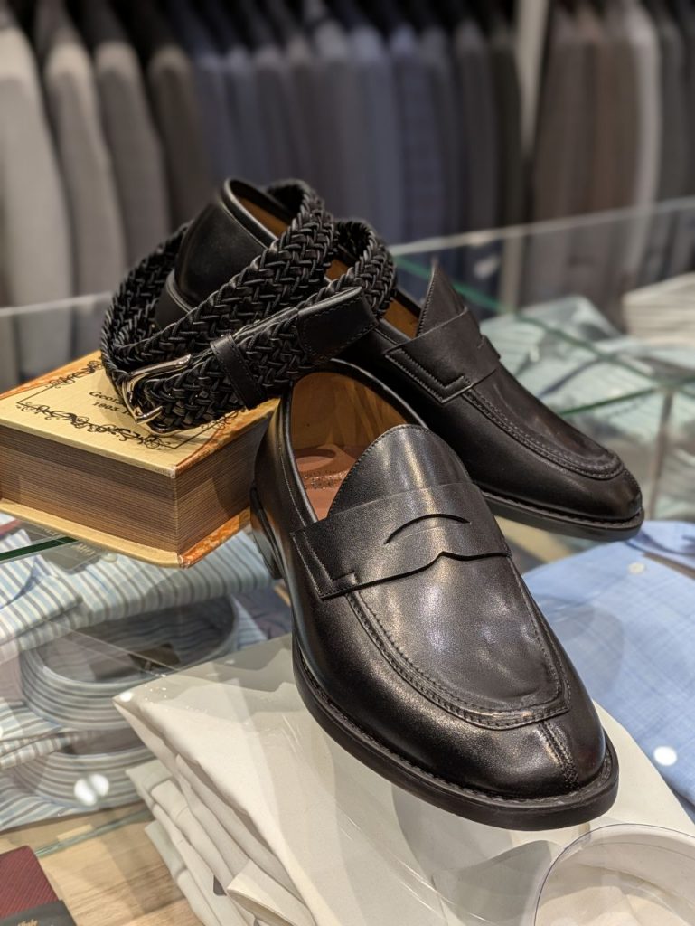 少しカジュアルなジャケパンスタイルには、コインローファーとメッシュベルトなどもいかがでしょうか。