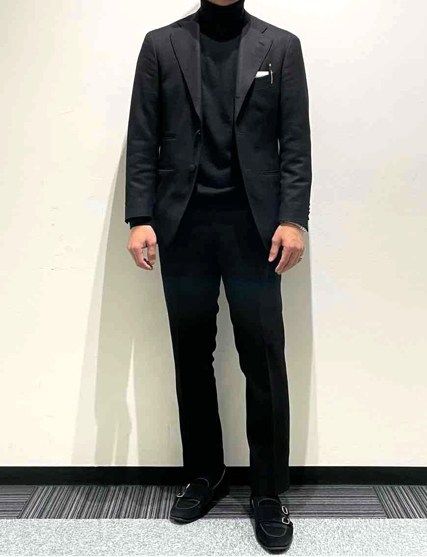 全体をオールブラックでまとめ、静かな存在感と個性を感じさせる一着です!