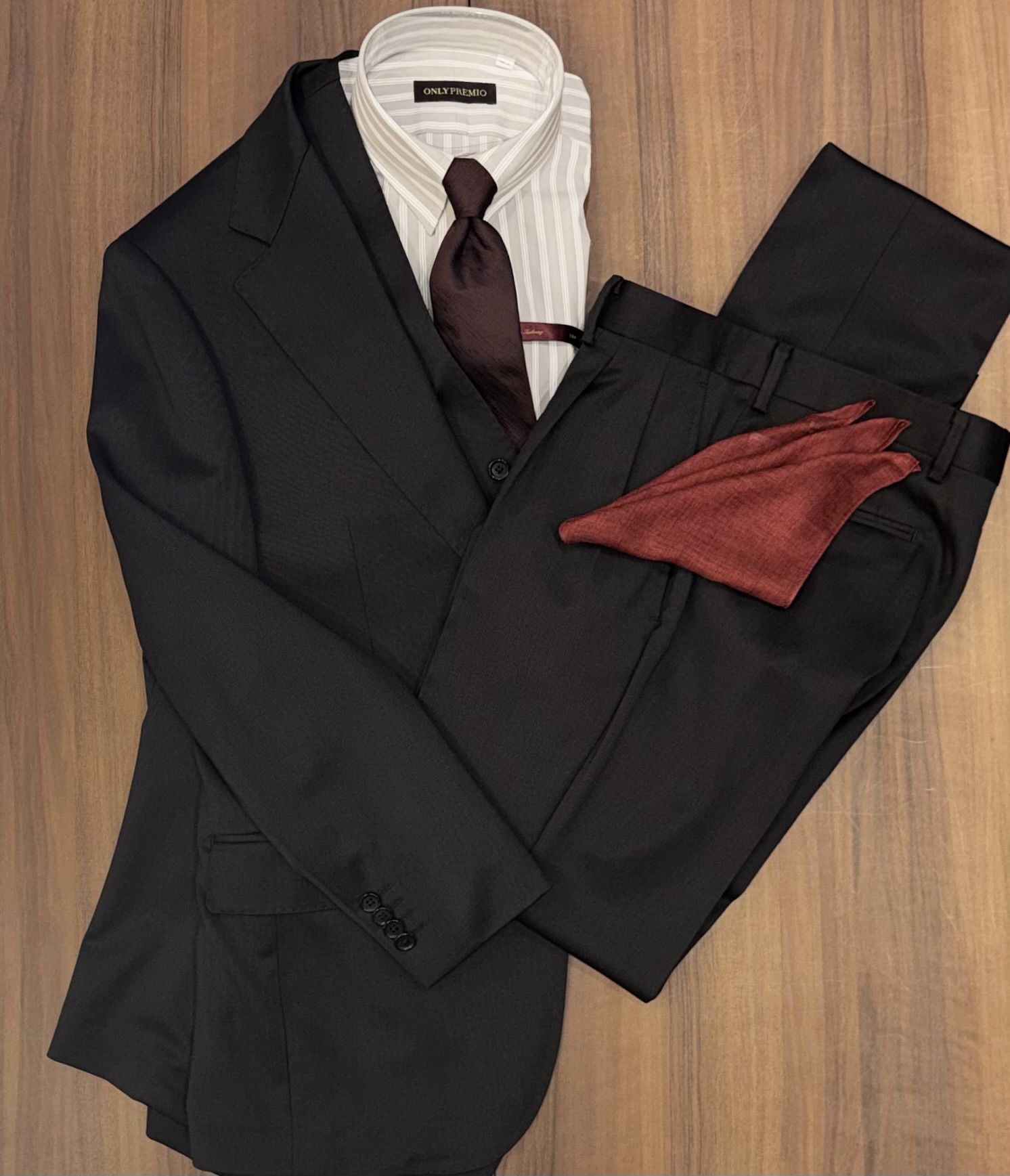 ゲスト側は色は少し抑えめに。ベージュのシャツと深い赤のネクタイで落ち着きをプラスします。