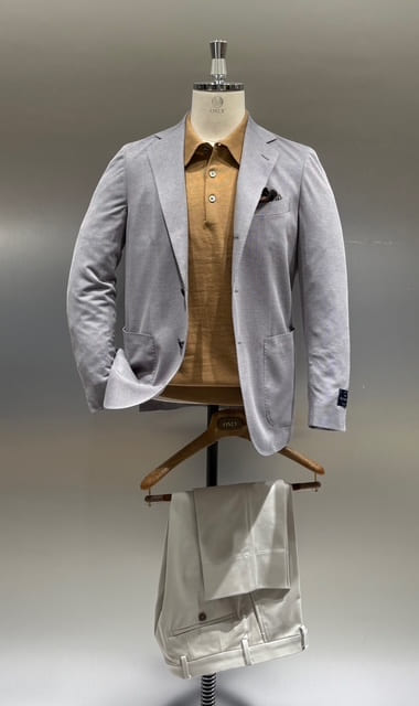 上品な素材感のジャケット、ポロシャツに合わせて大人のカジュアルスタイルを演出。