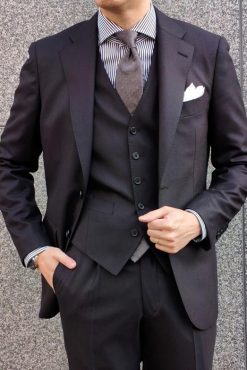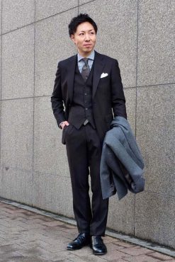 ネクタイに赤のアクセントを入れ、メリハリを付けているところもポイントです。