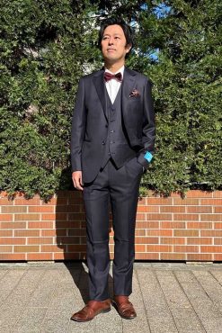 セレモニーから日常使いまで幅広く対応できる汎用性の高いスリーピーススーツ。