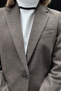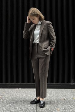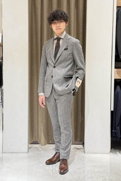 遠目には無地に見える織り柄と、わずかな起毛感が深みを生むブラウンスーツ。
