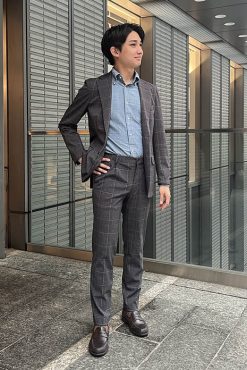 明るめのグレースーツにネイビーネクタイで清潔感をプラスしました。