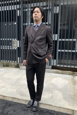 千鳥格子のスーツをブラックのスペアパンツでシックにまとめました。