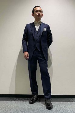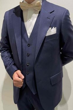 全体的にブラックで統一感も出しながら、小紋柄の蝶ネクタイとリバーシブルベストの柄で華やかさもあるコーディネートにしました。